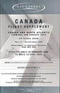 The Canada Flight Supplement (CFS) (French: Supplément de vol Canada) is a joint civil/military publication and is a supplement of the Aeronautical Information Publication (AIP Canada). It is the nation's official airport directory. It contains information on all registered Canadian and certain Atlantic aerodromes and certified airports.[1][2]
