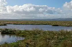 The breeding habitat of the water rail is permanent wetland with still or slow-moving fresh or brackish water and dense, tall vegetation, which may include common reed, reedmace, irises, bur-reed or sedges.[21] In coastal areas, sea rush is common in saltmarsh breeding sites, with sedges and bur-reed dominant in somewhat less saline environments. A study in the Netherlands and Spain showed that the rush provided better concealment than the other maritime plants. As elsewhere, nests were constructed from the nearest available plants.[30] Where it occurs, saw-sedge provides good breeding habitat, its tall (1.5 m (4.9 ft)) dense structure providing good cover for the nesting rails.[31] The preferred habitat is Phragmites reedbed with the plants standing in water,[32] with a depth of 5–30 cm (2.0–11.8 in), muddy areas for feeding and a rich diversity of invertebrate species. Locations with nearby willows or shrubs are favoured above large areas of uniform habitat. In addition to natural fresh or marine marshes, this rail may use gravel or clay excavations and peat workings as long as there is suitable habitat with good cover. It may be found in rice paddies or on floating islands,[21] and it occurs in Kashmir in flooded sugarcane fields.[27] A Finnish study showed that the main factor influencing the distribution of water rails was the extent of vegetation cover, with the highest densities in the most vegetated areas; the presence of other marshes nearby was also significant. However, factors such as temperature, rainfall, length of shore line and extent of peat, important for some other marsh birds, were not statistically relevant. The areas with the highest densities of the rail also had the greatest numbers of three species considered at risk in Finland, the great reed warbler, Eurasian bittern and marsh harrier.[33] The northern limit of breeding seems to be determined by the transition from nutrient-rich wetland to poorer, more acidic water. This leads to the replacement of common reed by a more open vegetation type dominated by marsh cinquefoil, which is unsuitable for the rails.[34]