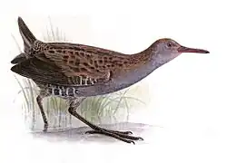 The rails are a bird family comprising around 150 species. Although the origins of the group are lost in antiquity, the largest number of species and the most primitive forms are found in the Old World, suggesting that this family originated there. However, the genus Rallus, the group of long-billed reed bed specialists to which the water rail belongs, arose in the New World. Its Old World members, the water, African and Madagascar rails, form a superspecies, and are thought to have evolved from a single invasion from across the Atlantic.[2] Genetic evidence suggests that the water rail is the most closely related of its genus to the Pacific Gallirallus rails,[3] and is basal to that group.[4] The water rail was first described by Carl Linnaeus in his 1758 10th edition of Systema Naturae under its current scientific name, Rallus aquaticus.[5] The binomial name is the Latin equivalent of the English "water rail"[6] that had been used by English ornithologists Francis Willughby in 1676[7] and by Eleazar Albin in 1731.[8]
