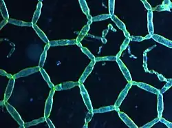 The water net (genus Hydrodictyon) is a taxon of freshwater green algae in the family Hydrodictyaceae. Hydrodictyon does well in clean, eutrophic water, and has become a nuisance in New Zealand, where it has been recently introduced. The name water net comes from the mesh structure of their colonies, which can extend several decimeters; the scientific name also means "water net" in Greek.[2]
