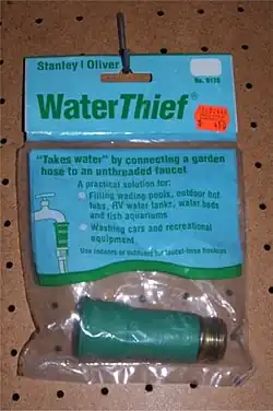 - A water thief is a synthetic rubber fitting that attaches to an unthreaded faucet (American English) / tap (British English) on one end and a common garden hose on the other. It is commonly used to fill fresh water tanks in recreational vehicles when a threaded hose bib is not available.
