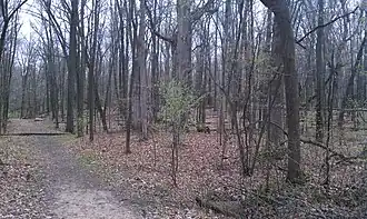 The Waterloo-Pinckney Trail is a 38-mile-long hiking trail which runs through Waterloo State Recreation Area and Pinckney Recreation Area in southeastern Michigan, United States. Part of the trail also passes through Park Lyndon County Park. The trail travels through glacial features such as eskers and kettle lakes as well as swamps and open meadows remaining from abandoned farmlands. Forest types include oak and pine. The trail tops out at 1,128 feet (344 m) on Sackrider Hill, 208 feet (63 m) above surroundings, the largest elevation gain. Other hills and ridges give 50-to-150-foot (15 to 46 m) rises. The trail is blazed with blue triangles and at some points shares trails with the Potawatomi Trail and the nature trails around the Eddy Discovery Center. Part of the trail is open to mountain biking and horseriding and hunting is allowed in most areas along the trail. The trail has several nearby campgrounds allowing it to be hiked as a 2, 3 or 4 day trip. Side trails to the campgrounds make the entire trip 40.5 miles (65.2 km).[1] The trail was first developed in the 1960s and the last link across the county park was completed in 1986.