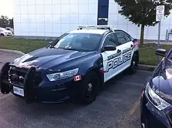 Marked cruisers are white, with hood, trunk lid, front and rear quarter panels and bumpers painted navy blue. The text Waterloo Regional Police in silver retroreflective text with a navy blue outline appears on the sides of the vehicles. A distinct solid red line curves from the front, through to the rear of the vehicle, with the motto "People Helping People" and "911" on the rear quarter panel. A series of white horizontal stripes appear above and below the curved red stripe. The crest of the police service appears on the rear pillar as well. A Canadian flag in addition to any special designations for the vehicle, such as "supervisor", "traffic", "duty officer" are displayed on the front fender. On the rear of the cruiser, the text "Waterloo Regional Police" is displayed on the left side of the trunk lid, and the vehicle number and divisional designation (where applicable) on the right side. On the bumper appears the police service website (wrps.on.ca), along with the Crime Stoppers tip-line number encompassed by retroreflective chevrons. Affixed to the roof is a red and blue LED light bar, as well as several antennas for communication and GPS.