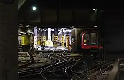 Waterloo Underground Depot is a London Underground maintenance depot which stables the Waterloo & City line's fleet of 1992 Stock trains. The depot is entirely below ground and is situated beyond the Waterloo & City line platform end at Waterloo Underground station.[2] Trains from Bank reverse at the depot before returning. It is one of the smallest depots on the Underground network, and one of the only two depots to be completely underground, the other being White City Depot on the Central line. For larger items like rolling stock, lengths of rail and other heavy machinery, access to the depot can only be achieved via a shaft on Spur Road, requiring a large crane to do so.[3]