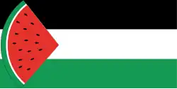 The flag of Palestine, coloured in the Pan-Arab colors of red, green, white and black, had been banned in Israel in certain situations, leading to the locally-grown and similarly-coloured watermelon taking its place in Palestinian iconography as an alternative for decades.[4] Following the 1967 Six-Day War, Israel banned the display of the Palestinian flag and its colours in the Gaza Strip and the West Bank, with the Israeli army allegedly arresting anyone who displayed it.[5][6]