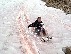 Watermelon snow, also called snow algae, pink snow, red snow, or blood snow, is a phenomenon caused by Chlamydomonas nivalis, a species of green algae containing a secondary red carotenoid pigment (astaxanthin) in addition to chlorophyll. Unlike most species of fresh-water algae, this species appears to be cryophilic (cold-loving) and thrives in freezing water.[1]