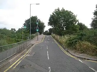 ![]() Vicarage Road railway bridge Looking northeast towards the hospital The site of the proposed station was to be on the left of the bridge | |