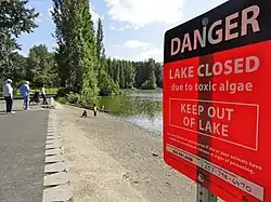 Algae in Waughop Lake has affected the lake for a long time. The algae are fed by nitrogen, supplied by the duck droppings and sediment, which the lake has plenty of. There are serious algae blooms, and it is not advisable to come into contact with the water. During algae blooms, the lake may be closed or restricted to visitors. For some of the year, fishing is restricted due to the algae problem. The bulk of the algae is green cyanobacteria, a phylum or waterborne photosynthesizing prokaryotes.