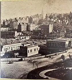 Halfway across the bridge, on the eastern side, is the station's former parcels office, also Category A listed as part of the station.[1] The structure was converted into a restaurant in the 1980s and is now in operation as a public house.[3] At the northeast corner of the bridge, at the junction with Princes Street, is the Waverley Market shopping centre. There is a Transport for Edinburgh Travelshop at the southeast corner with Market Street which was built for the earlier station of the late 1860s.
