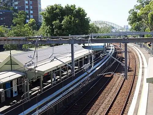 Waverton railway station is a heritage-listed suburban railway station located on the North Shore line, serving the Sydney suburb of Waverton in New South Wales, Australia. It is served by Sydney Trains T1 North Shore line services. The station is located on Bay Road, Waverton, in the North Sydney Council local government area of New South Wales, Australia. It was designed and built by New South Wales Department of Railways. It is also known as Waverton Railway Station group. The station was added to the New South Wales State Heritage Register on 2 April 1999.[3]