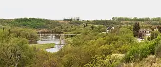 Wawanesa is the second name for the community which was originally called Sipewiski, an Indigenous word meaning "crooked river" or "light through the trees".[3][4] This name was changed by clerics in the region in 1890 during the temperance movement after it was believed to mean or sound like "sip of whisky".[3] Following this, the community's name was changed to Wawanesa, which has various meanings depending on which Indigenous language is used a source for the name. The first thought is that the name is considered to come from the Ojibwa word waa’oonesii, which means 'whippoorwill'.[4][5] A second understanding is that the name comes from the Cree words for 'goose nest' as wawa means 'goose' and nesa means nest.[6] A third explanation for the name comes from the Dakota-Sioux words wa-wa-neche which means 'land of no snow', thought to come from the cliffs which appear snow free throughout the winter.[6]