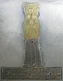 Hic jacet Alyanora Pollard qui fuit uxor Joh(ann)is Pollard et filia Joh(ann)is Copleston qui obiit xxi die mensis Septembris Anno d(o)m(in)i Mill(ensi)mo CCCCXXX cuius animae propitietur Deus Amen.[21] (Here lies Eleanor / Alianore Pollard who was the wife of John Pollard and daughter of John Copleston who died on the 21st day of the month of September in the One thousandth four hundredth and thirtieth year of Our Lord of whose soul may God look upon with favour Amen.)