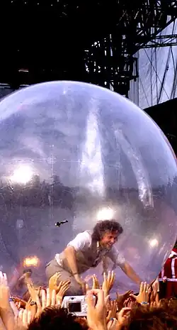 During large-crowd festival performances, Coyne makes his entrance by descending from an alien mother ship (a nod to Parliament-Funkadelic[9]) in a bubble and floats across the audience. Coyne has also been known to pour fake blood down his face via a hidden tube during live shows. Coyne does this to pay homage to a famous picture of Miles Davis who, after a performance, had blood on his suit because a police officer had beaten him during the show.