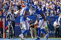 Gallman was selected by the New York Giants in the fourth round, 140th overall, in the 2017 NFL draft.[33][34] He was the 14th running back selected in that year's draft.[35] Gallman made his NFL debut and scored his first NFL touchdown on October 1, 2017, in a loss to the Tampa Bay Buccaneers.[36] This game coincided with his 23rd birthday. Overall, in his rookie season, he finished with 476 rushing yards to go along with 34 receptions for 193 receiving yards and a receiving touchdown.[37] Gallman scored his first rushing touchdown in Week 17 against the Dallas Cowboys on a one-yard run.[38] Overall, he finished the 2018 season with 176 rushing yards and rushing touchdown.[39]