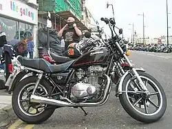 Whilst at Kawasaki, as director of technical operations, Moulton introduced the LTD motorcycle series.[3] These brought custom-styling touches to the in-line four-cylinder Kawasaki Z1 standard street-bike/roadster model. The LTD style was typified by shortened mudguards (fenders), stepped seat, high handlebars, a 'tear-drop' petrol tank, large rear tyre and short megaphone exhausts. Moulton was quick to emphasise that his design was not influenced by the American manufacturer, Harley-Davidson but rather privately customised British motorcycles like the Triumph and Birmingham Small Arms.[1] The first Moulton-designed model, the KZ900LTD was introduced in 1975 and was immediately successful with demand outstripping supply.[1] Moulton's LTD styling spawned similar designs from Kawasaki's competitors, with Yamaha's 'Special' series being extremely successful.[1]