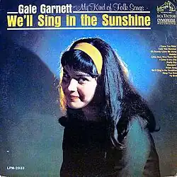 "We'll Sing in the Sunshine" is a 1964 hit song written and recorded by Gale Garnett which reached No. 2 in Canada,[1] and No. 4 on the U.S. Billboard Hot 100 chart for the week ending 17 October 1964.[2] It also enjoyed success on easy listening and country music radio stations, spending seven weeks at No. 1 on the Billboard Easy Listening chart[3] and No. 42 on the country chart. The Cash Box Top 100 ranked "We'll Sing in the Sunshine" at No. 1 for the week of 31 October 1964, and it also reached No. 1 in Garnett's native New Zealand that November.[4] In Australia, "We'll Sing in the Sunshine" afforded Garnett a Top Ten hit with a No. 10 peak in October 1964. Garnett's sole Top 40 hit, "We'll Sing in the Sunshine" won the Grammy Award for Best Ethnic or Traditional Folk Recording in 1965.