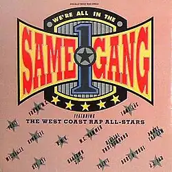 "We're All in the Same Gang" is a hip hop song by a collaboration of prominent American West Coast hip hop recording artists under the West Coast Rap All-Stars umbrella, who assembled to promote an anti-violence message. It was released on May 22, 1990 through Warner Bros. Records as the lead single and a title track from the compilation album of the same name. Produced by Dr. Dre, the posse cut features contributions from King Tee, Body & Soul, Def Jef, Michel'le, Tone-Lōc, Above The Law, Ice-T, Dr. Dre, MC Ren, J. J. Fad, Young MC, Digital Underground, Oaktown's 3.5.7, MC Hammer and Eazy-E, with the voice of the news reader in the song's intro was done by then-future World Championship Wrestling announcer Lee Marshall. Music video for the song was directed by Ken Andrews.