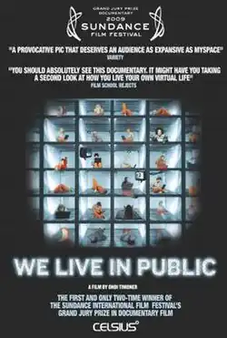 We Live in Public was screened six times at the 2009 Sundance Film Festival before being awarded the Grand Jury Prize in the U.S. documentary category.[7] Timoner is the first director in the Sundance Film Festival's history to twice win the Grand Jury Prize for Documentary, having won in 2004 with Dig!.[8][9] We Live in Public was runner-up for Best Documentary at the 2009 Karlovy Vary International Film Festival.[10]