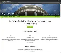 We the People, launched by the Obama administration on September 22, 2011,[3] active until January 20, 2021, the day of the inauguration of Joe Biden,[4] is a defunct section of the whitehouse.gov website used for petitioning the administration's policy experts. Petitions that reached a certain threshold of signatures were reviewed by Administration officials who in most instances would subsequently provide an official response.[3] Legal proceedings in the United States were not subject to petitions, rather, the site served as a public relations mechanism for the presidential administration to provide a venue for citizens to express themselves. On August 23, 2012, the White House Director of Digital Strategy Macon Phillips released the source code for the platform.[5] The source code is available on GitHub, and lists both public domain status as a work of the United States federal government and licensing under the GPL v2.[2]