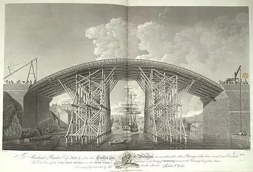 The bridge was instigated, sponsored and patented by Rowland Burdon, the Member of Parliament for County Durham, and built under the direction of Thomas Wilson, who designed its architectural features.[2]