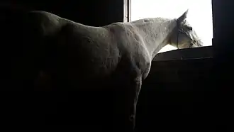 Ultimately, the housing condition of horses is considered to be the cause of stable vices such as weaving.[3] There are no reports of wild horses displaying weaving behaviour, mainly because these horses are in their natural state, i.e. they are not confined or on a schedule. Domestic horses are often housed in stalls (typically 8x8 or 12x12) at night, and are allowed turnout (i.e. time outside) during the day. Horses that are housed in solitary confinement from other horses, or those that do not get daily turnout, or inadequate turnout, are more at risk for developing stable vices such as weaving.[3]