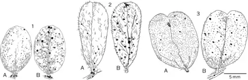 Leaflets. Left to right: W. raimondiana, W. chilensis, W. brongniartioides