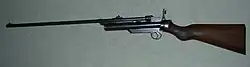 The Mark II, known as the service air rifle because of its use by the UK military, used break-action with a superimposed barrel locked by bolt action. The detachable barrel was easily interchangeable with others of the three calibres available.[11]