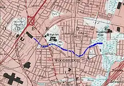 The brook arises near Woodbridge High School, flows east, and crosses Wedgewood Avenue, Amboy Avenue and Barron Avenue before entering Woodbridge River in the Woodbridge River Park. Interest in the brook has increased as it has had recurrent flooding in recent years. Woodbridge is bordered on the east by the Arthur Kill, into which the Woodbridge River flows. There is a history of tidal flooding along this river and its tributaries. Woodbridge rivers have been described as having a "high flow, flashy nature;" in addition to tidal flooding, fluvial flooding is also common. The land is relatively impervious, and flooding is exacerbated steep slopes, urban cover and outflow block. The twin culvert size at the railroad crossing just downstream from Barron Avenue is 4x4 feet; this leads to severe upstream flooding. It is estimated that a 100 year flood will put the area under nine feet of water and affect 42 homes.[1] Frequency of flooding has increased over time. Residential areas moved into previous marsh land, decreasing the ability of the land to absorb excess water. Wedgewood Brook is the northern boundary of the area most affected from Hurricane Sandy, Watson-Cramptom. Prior to 2009 this area was zoned for high density residential housing, including the area consisting of wetlands and meadows.[2] When the Sandy came, there was a combination of tidal and fluvial flooding; it was "characterized as a tsunami-like water wall," destroying adjoining homes.[3] After Sandy, using money from the New Jersey Buyout Program,[4] Woodbridge bought out and demolished many residential properties in the flood hazard areas.[5] Woodbridge's actions and plans have been called a "slow motion evacuation from climate change." As people move out of flood hazard areas, they will replaced by a "floodplain forest of native trees, shrubs and grass."[6] In Woodbridge not everybody wants to sell; 2050, when the properties may be under water, seems too far in the future for some.[7] This interferes with the goal of land buffers, entire blocks, between rivers and homes.[8]