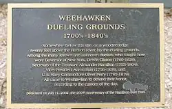 Not far from Deas' was a ledge 11 paces wide and 20 paces long, situated 20 feet (6.1 m) above the Hudson on the Palisades. This ledge, long gone, was the site of 18 documented duels and probably many unrecorded ones in the years 1798–1845. The most famous is the duel between Alexander Hamilton, first Secretary of the Treasury, and Aaron Burr, then Vice President of the United States, which took place on July 11, 1804;[33] this duel was re-enacted on its 200th anniversary (July 11, 2004) by descendants of Hamilton and Burr.[34] Three years earlier, a duel was held at this spot between Hamilton's son, Philip Hamilton, and George Eacker.[35] (Another source, however, puts the duel in Paulus Hook in Jersey City.[36]) Phillip, who had been defending his father's honor, suffered a fatal wound in his hip and his left arm and died two days later on November 24, 1801.[35]