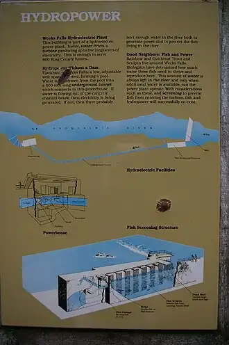 Weeks Falls is a waterfall on the south fork of the Snoqualmie River, located near North Bend, Washington, USA, just south of Interstate 90 at exit 38. The falls are at the end of the road that goes past the Olallie State Park ranger headquarters.[1] From the gravel parking lot, there is a paved accessible overlook to see the falls and a small area around the hydro-electric plant. There is also a ¼ mile accessible interpretive trail nearby.[2]