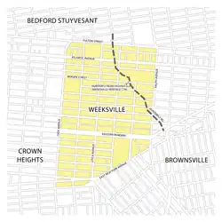 The village itself was established by a group of African-American land investors and political activists, as an intentional landowning community.[2][6] It covered an area in the borough's eastern Bedford Hills area, bounded by present-day Fulton Street, East New York Avenue, Ralph Avenue and Troy Avenue.[1] A 1906 article in The New York Age recalling an earlier period noted that James Weeks "owned a handsome dwelling at Schenectady and Atlantic Avenues."