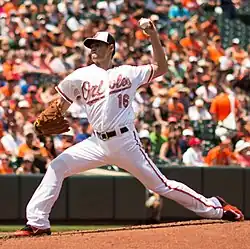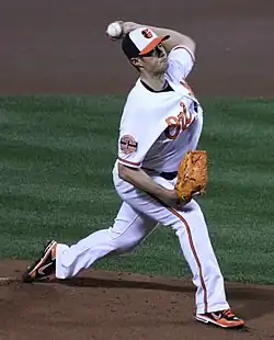 Chen was an "extreme flyball pitcher", at one point having an HR/9 innings of 1.3, way above MLB average.[41] Chen pitched from a three-quarters arm slot and threw a four-seam fastball averaging 91–92 mph (which topped out at 95–96 mph).[42] In addition, he threw a two-seamer, a slider, a changeup, and an occasional curveball.[42] Since he previously pitched in Japan where he started on five days rest rather than four, with the Orioles he initially had durability issues and was 0–4 in his last seven starts in 2012.[43] Chen has been described as a legitimate middle-of-the-rotation starter.[44][45] An opposing scout said, "I watched Wei-Yin Chen and swore I was watching Tom Glavine. He has such an effortless delivery and an above-average change up, and knows how to pitch inside."[46]