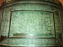 On the top of the Bell, a 2-heads-no-tails dragon appears, with four legs and five toes on each leg. The wall is divided into panels and bands by raised lines and filled with cartouches containing a dedicatory inscription. Around the lower edge, the eight trigrams in a band separated by cloud, and a band of waves runs around the lower edge.[1] Most of the text is from the Sutra of the Names of the 35 Buddhas and the Vinaya Sutra.