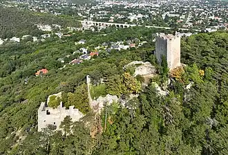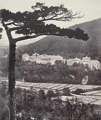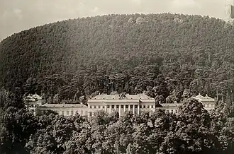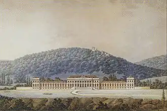 Shortly, after the marriage he decided to construct a summer residence as a present for his wife.[1] The location for the palace was in Baden near Vienna, a spa town favoured by the Viennese elite and members of the imperial family, who constructed extensive villas nearby.[3][4] The chosen plot was at the entrance of the Helenental valley, at the foot of a hill dominated by the ruins of Rauheneck castle and opposite the ruins of Rauhenstein castle. The land was owned by the Doblhoff family, who sold it to the archduke.
