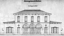 The first Weilheim station building was opened in 1866. It was a three-story symmetrical building with a hip roof in the neoclassical style. The facades of the main building were richly structured. To the north and south of the main building there were single-storey extensions with flat roofs, which were the same size as each other. An unusual feature was that the platform canopy over the “home” platform extended along the entire length of the building, which was more common in Austria than in Germany at the time. In the 1900s, a further single-storey building with a hip roof was built on to the southern extension; this included a station restaurant. The platform canopy was extended accordingly. During World War II, the northern part of the building was destroyed in an air raid on 19 April 1945.