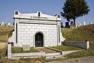 Weiskittel-Roehle Burial Vault is a historic burial vault located in Section P, Loudon Park Cemetery, Baltimore, Maryland. It is a rectangular structure made of cast iron built into the side of a hill, constructed to look like ashlar masonry and painted gray. It was made as the tomb of Anton W. Weiskittel who died in 1884, a Baltimore iron founder.[2]