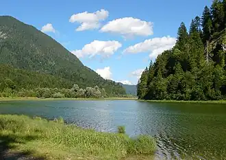 Weitsee is a small lake on between Reit im Winkl and Ruhpolding with an area of 63.60 ha and a maximum depth of 9.30 m. The lake itself is separated into a shallow western and a deeper eastern part by a mountain peninsula. It is the first lake in the Dreiseengebiet (Three Lake Area) followed by the Mittersee and Lödensee. The lakes are located in the valley between the Gurnwandkopf und Dürrnbachhorn next to the Deutsche Alpenstraße B305 (German Alpine Street).