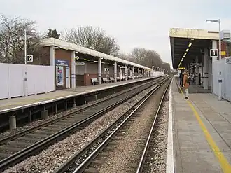 Eltham railway station is on the east side of Well Hall Road, built in 1985, partially above the A2 road, replacing the stations at Eltham Well Hall and Eltham Park on the same line. The railway line crosses east to west passing over both Well Hall Road and Rochester Way, to the east is central London stations, and to the west Dartford and other Kent stations. It is in Travelcard Zone 4, operated by Southeastern and on the Bexleyheath Line. The station has two platforms, platform 1 for services to Central London and platform 2 for Dartford. There are two trains per hour to London Charing Cross, London Cannon Street, London Victoria, Barnehurst and four trains per hour to Dartford.