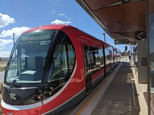 Well Station Drive is a light rail station on the Canberra Metro R1 Civic to Gungahlin line, located at the intersection of Well Station Drive and Flemington Road. It serves the residential suburb of Harrison, the Shirley Smith High School in Kenny[1] and is the closest station to many businesses in Mitchell. The station's location and lack of suitable footpaths makes access to the industrial area difficult for pedestrians,[2] leading to safety concerns within the community.[3] Bicycle racks and "kiss and ride" bays are currently installed around the intersection adjacent to the station.[4]