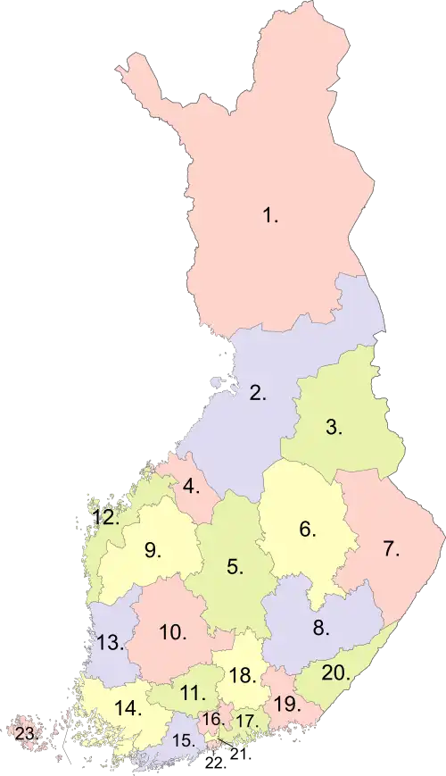 The wellbeing services counties (Finnish: hyvinvointialue, Swedish: välfärdsområde, Northern Sami: buresveadjinguovlu, Inari Sami: pyereestvaijeemkuávlu, Skolt Sami: pueʹrrvââjjamvuʹvdd)[1] are responsible for organising health, social and emergency services in Finland. There are 21 wellbeing services counties and the county division is mainly based on the region division.[2] The public authorities are separate from the municipalities and from the central government.
