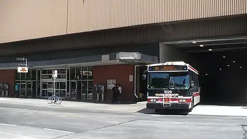 This station is located on the north side of Wellesley Street East east of Yonge Street. It is built on two levels, with the main Wellesley Street entrance and bus platform at street level and the subway platforms located on the lower level.[8] There are elevators from street level to the two platforms.[4] A Gateway Newstands can be found in the station. There is a second automatic entrance on Dundonald Street.[9][10][7]