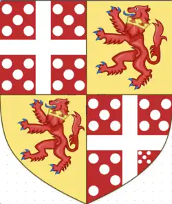 According to Burke's peerage, the family can trace its unbroken lineage back to Waleran de Wellesley.[3] Waleran was an itinerant justice, and became first itinerant justice in 1255.[4] He was the first member of the family to settle there.[5] Although, it has been suggested that the first known Wellesley, Guy, was made a Thane by Athelstan in 938 and also resided near Wells in Somerset. [6] Waleran's male line descendants went extinct with the death of Garret Wesley in 1728. However, the Wellesley estates and arms were inherited by a cousin Richard Colley, the future Baron Mornington, who descended from this family through female line .[2]