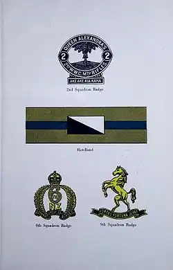 Raised on 8 August 1914 at the start of the First World War, the Wellington Mounted Rifles Regiment came from the region around Wellington on the North Island of New Zealand. It was commanded by Lieutenant-Colonel William Meldrum,[4][5] and comprised a headquarters, a machine-gun section, and three squadrons formed from Territorial Force regiments.[6] The New Zealand Territorial Force included a compulsory training system, and the four Military Districts were each required to supply a mounted regiment for the New Zealand Expeditionary Force. To meet that obligation the Territorial Force regiments each provided a squadron, which kept their own regimental badges and traditions.[7] The regiment's squadrons came from the Queen Alexandra's 2nd (Wellington West Coast) Mounted Rifles (2nd Squadron), the 6th (Manawatu) Mounted Rifles (6th Squadron) and the 9th (Wellington East Coast) Mounted Rifles (9th Squadron).[8] The establishment was fixed at twenty-six officers and 523 other ranks, who used 528 riding horses, seventy-four draught horses and six pack horses. Each squadron, of 158 men, had a field headquarters and four troops. The Machine-Gun Section, with two Maxim Guns, had one officer, twenty-six other ranks, twenty riding horses and sixteen draught horses.[4] Although the regiment used horses, they were not cavalry but mounted infantry, and expected to ride to the battlefield, dismount and then fight as traditional infantry.[5][9] Attached to, but not part of, the regiment were medical and veterinary officers, an artificer, three more other ranks and another eighteen horses.[4] The regiment was assigned to the New Zealand Mounted Rifles Brigade, serving alongside two other regiments, the Auckland Mounted Rifles and the Canterbury Mounted Rifles.[10][11]
