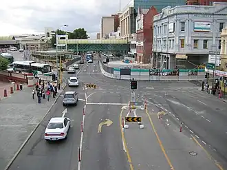 The main transport facilities on the street have included the Wellington Street bus station and the Perth railway station. In 1933 the first permanent trolleybus system in Australia ran along Wellington Street.[12] The underground Perth Busport, which opened in 2016 to replace the Wellington Street bus station, is located partially underneath the street, with a ramp for bus access originating at the intersection between Wellington and William Streets.