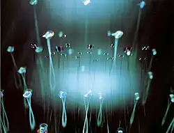 Tsai is a Chinese-born sculptor now living in New York. The slender, stainless steel "cybernetic" rods of his sculpture vibrate in different patterns in response to electronic impulses, to the clapping of human hands, or to the flashes of a strobe light. In the artist's words, they are designed to simulate "the intensity of a living creature".[18]