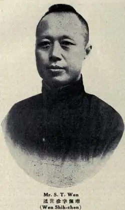 Wen Shizhen (simplified Chinese: 温世珍; traditional Chinese: 溫世珍; pinyin: Wēn Shìzhēn; Wade–Giles: Wen Shih-chen; 1877–1951), also known as S. T. Wen, was a politician and diplomat in the Republic of China. He was Mayor of Tianjin during the Provisional Government of the Republic of China and the Wang Jingwei regime (Republic of China-Nanjing). His courtesy name was Peishan (佩珊). He was born in Tianjin.
