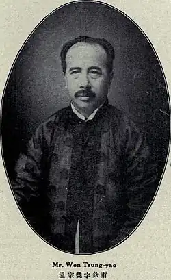 Wen Zongyao or Wen Tsung-yao (traditional Chinese: 溫宗堯; simplified Chinese: 温宗尧; pinyin: Wēn Zōngyáo) (1876[1] – November 30, 1947), courtesy name Qinfu (欽甫), was a politician and diplomat in the Qing dynasty and the Republic of China. In the late Qing era, he belonged to the pro-reform group. In the era of the Republic, he participated in the Sun Yat-sen's Canton Militarist Government. However, during the invasion of Japanese, he was a leading politician in the Reformed Government of the Republic of China and the Wang Jingwei regime, which were puppets state installed by the Japanese. He was born in Xinning, now Taishan), Guangdong.