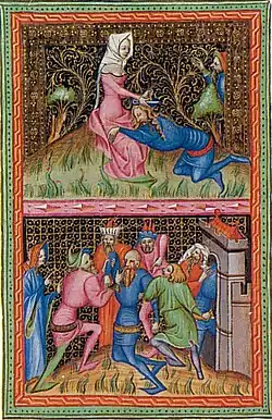 The Wenceslas Bible[1] (German: Wenzelsbibel) or the Bible of Wenceslaus IV (Czech: Bible Václava IV.) is a multi-volume illuminated biblical manuscript written in the German language. The manuscript was commissioned by the King Wenceslaus IV of Bohemia (that time also the King of the Romans) and made in Prague in the 1390s. The Wenceslas Bible is unique and very precious not only because of its text, which is one of the earliest German translations of the Bible, but also because of its splendid illuminations. Inside the manuscript contains images relating to 14th century politics as well as images of "Wild Men", an iconographic representation of man's temptation towards barbarism. This oldest German deluxe Bible manuscript[2] remained uncompleted.[1]