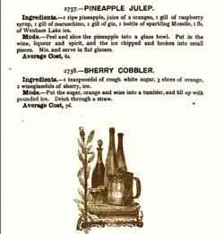 At the end of the 1840s, the ice from Wenham Lake became a luxurious commodity in London. The company opened offices all over Great Britain and Ireland.[2] In large institutions for poor sick people, wrote Florence Nightingale (1859), Wenham Lake ice stopped the milk curdling in summer.[3] By 1888 Mrs Beeton printed a cocktail recipe that used Lake Wenham ice; some Victorian households had iceboxes cooled with it.[4] In 1866, Massey & Son's Biscuit, Ice & Compote Book; Or, The Essence of Modern Confectionery advised wealthy entertainers to "send a block of Wenham Lake ice to the turners to be turned into the form of an elegant vase" to make an "elegant and novel stand."[5]