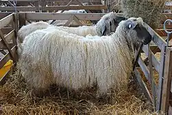The Wensleydale is a British breed of domestic sheep.[1][3] It is named for the Wensleydale region of North Yorkshire, in the north of England, where it was bred in the early nineteenth century by cross-breeding a Dishley Leicester ram with local long-woolled sheep of a breed that is now extinct.[2] It has a blue-grey face and long purled wool, and is among the heaviest of British sheep breeds. It is an endangered breed, and is categorised as "at risk" by the Rare Breeds Survival Trust.[2] It is often used as a ram breed to cross with other breeds to obtain market lambs, and for its high-quality wool.[2]